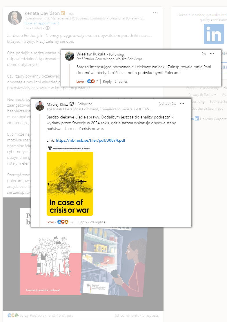Nasze porównanie poradników poradników dla ludności w Polsce i w Niemczech uzyskało pozytywny komentarza ze strony członków najwyższego dowództwa Wojska Polskiego (poniżej zrzut ekranu komentarzy do naszego postu z linkiem do niego.).
